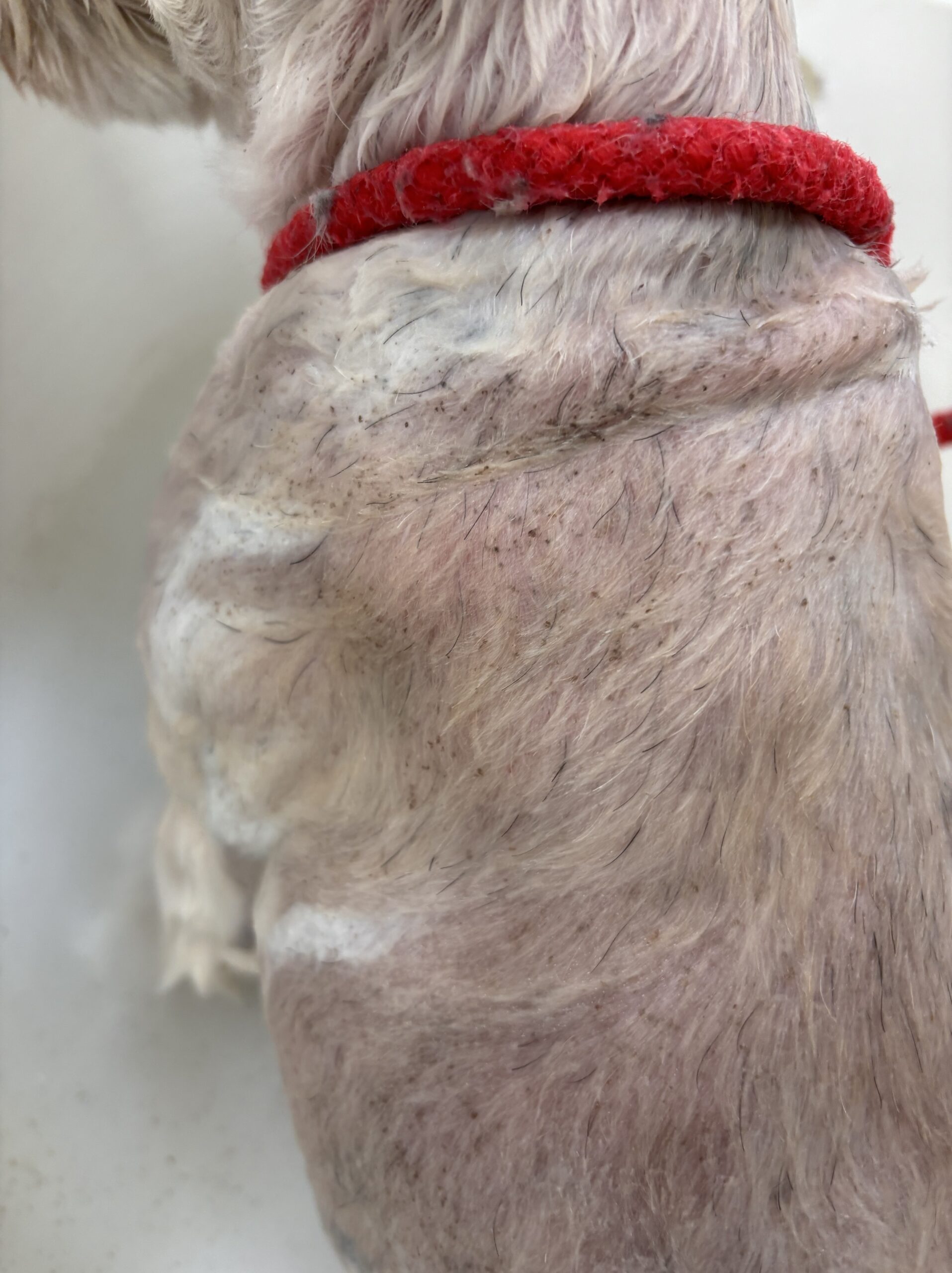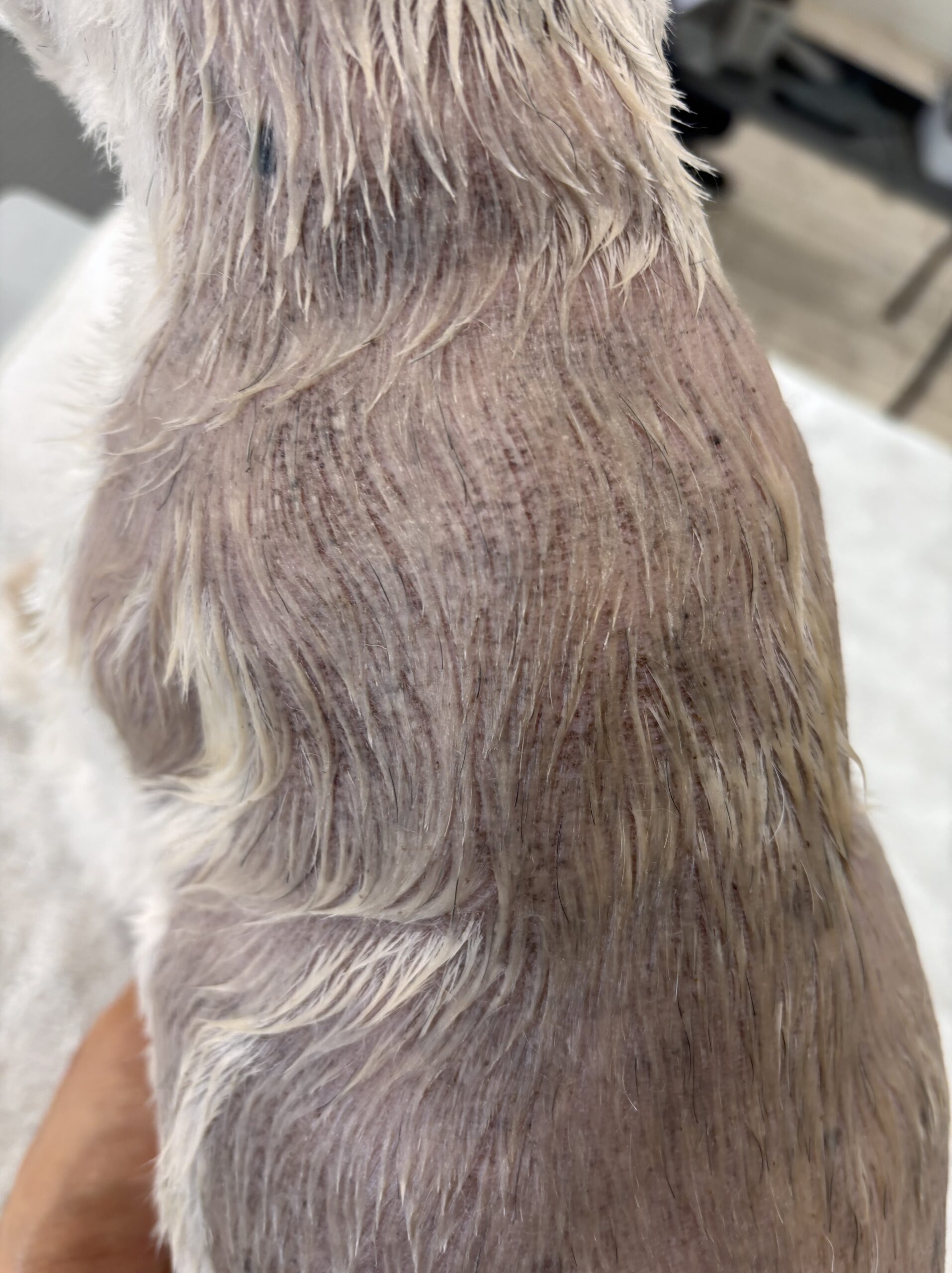 一見、毛も白くてフケっぽい感じはあるものの、「まぁ年齢的な乾燥かな!?」と思っていた。
